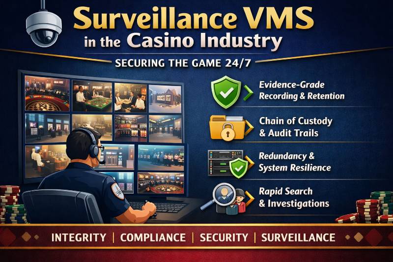 Casino surveillance isn’t “just CCTV.” It’s a regulated, evidence-grade, 24×7 operation that sits at the center of game integrity, dispute resolution, fraud prevention, and guest safety. A modern Surveillance VMS (Video Management System) is the software-and-systems layer that collects, records, indexes, secures, and retrieves video from hundreds—or thousands—of cameras across gaming floors, cages, count rooms, table pits, entrances, back-of-house corridors, and high-risk operational zones.